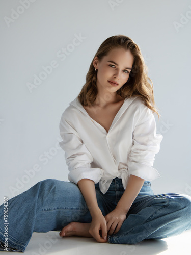 Beauty and fashion . Beautiful brown haired with stylish hairstyle. Woman with a curly hair. Beautiful young woman . Closeup portrait of an attractive girl with a brown makeup.