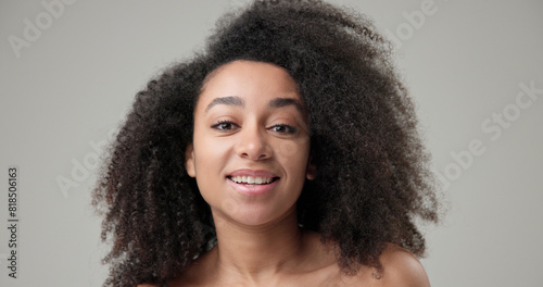 Beauty and Healthcare concept - Beautiful African American woman with curly afro hairstyle hair and clean, healthy skin on gray studio background posing and looking at camera