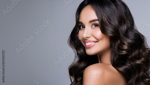 Beauty brunette girl with long shiny curly hair . Beautiful smiling woman model wavy hairstyle .
