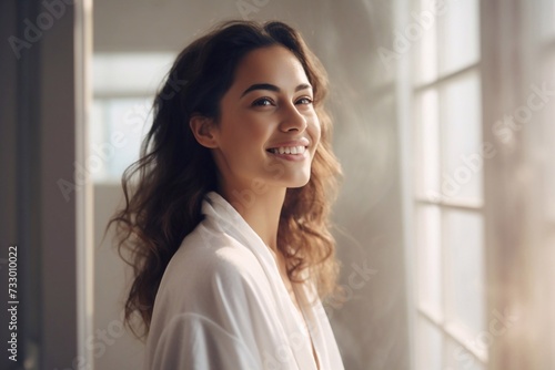 Beauty Concept. Portrait Of Attractive Happy Woman Looking At Mirror In Bathroom, Beautiful Millennial Lady Wearing White Silk Robe Smiling To Reflection, Enjoying Her Appearance, Selective Focus