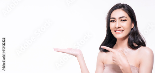 Beauty, cosmetics, healthy, treatment, skincare and spa concept. Charming young woman holding own hand with clean fresh skin while pointing at product or empty over isolated white background.