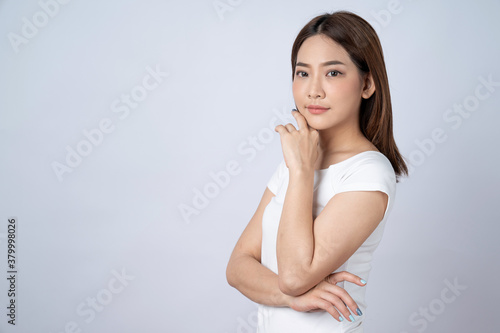 Beauty face Asian woman smiling and looking at the camera, Isolated on white background.