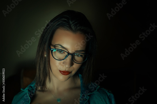 Beauty Fashion model girl with long brown hair wearing stylish glasses.