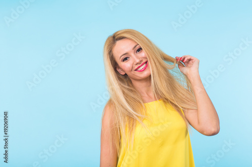 beauty fashion summer portrait of blonde woman with red lips and yellow dress on blue background with copy space