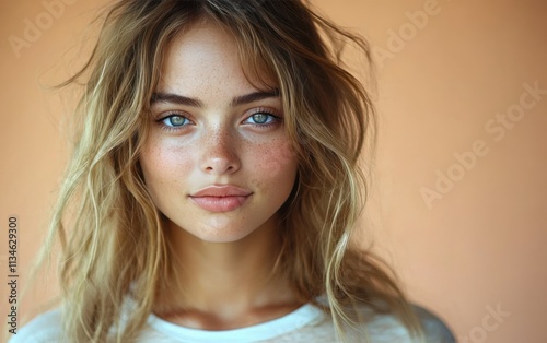 Beauty girl smiling and wearing a t-shirt in studio color background