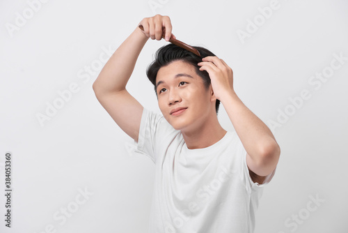 beauty, grooming and people concept - smiling young man brushing hair with comb over white background