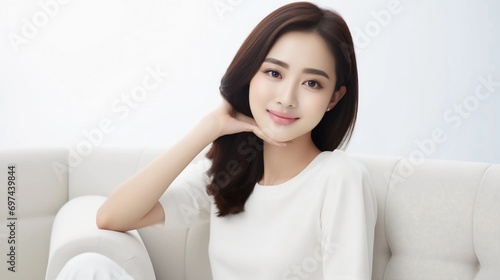 Beauty model portrait of young Asian woman with white and clean skin, beautiful smiling expression, graceful posing on sofa