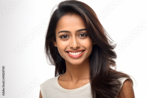 Beauty portrait of a pretty young Indian woman on light background with selective focus and copy space. AI generated