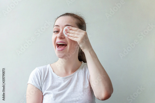 Beauty portrait of a smiling brunette woman with soft healthy skin removing make up with cotton pad isolated over white background. Skincare cleansing spa relax concept