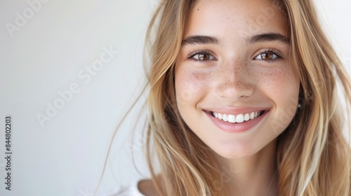 beauty portrait of blonde smiling young woman girl clean fresh face isolated on white background close up copy space