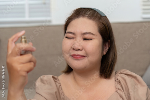 Beauty Rituals and Self-Care. A woman enjoying a facial mist, embracing her beauty routine with joy and relaxation.