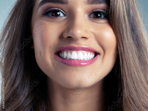 Beauty, smile and teeth with portrait of woman in studio on blue background for aesthetic wellness. Cosmetics, face and skincare with happy model at dentist, proud of dental hygiene or oral care