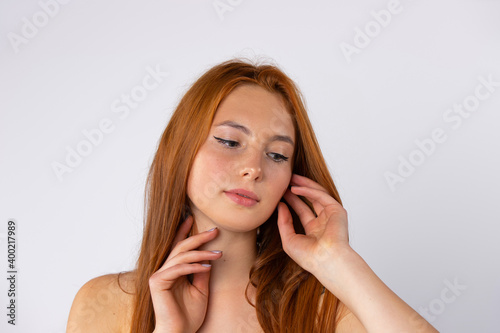Beauty, spa and glowing skin concept. The red-haired girl poses and looks at the floor on white background.