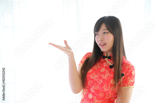 beauty woman wear red cheongsam looking and smile in chinese new year