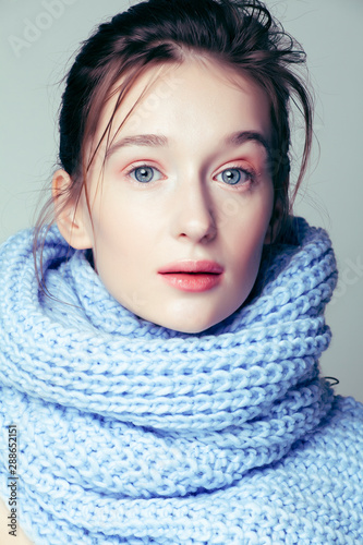beauty young blond woman in scarf with weathered lips close up isolated, dehydrated winter skin cosmetic concept