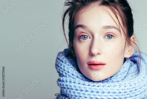 beauty young blond woman in scarf with weathered lips close up isolated, dehydrated winter skin cosmetic concept