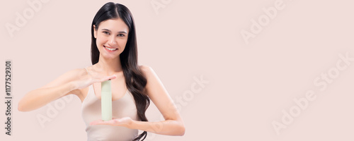 Beauty young woman holding and presenting a skincare product against a soft beige background. Ideal for beauty, skincare, and wellness advertising or promotional materials.