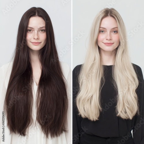 before-and-after photo of hair coloring, first photo long dark hair to the waist, second photo long light hair to the chest, identical hair length and style, studio background.
