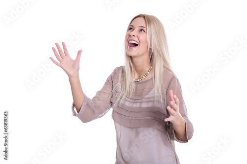 Begeisterte junge blonde Frau isoliert auf Weiß