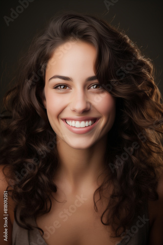 Big bright white smile headshot with a beautiful brunette woman sincere happy cheerful positive expression