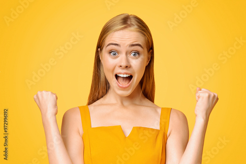 Big Win. Overjoyed Teen Girl Emotionally Rejoicing Success With Raised Fists, Standing Over Yellow Background, Looking At Camera