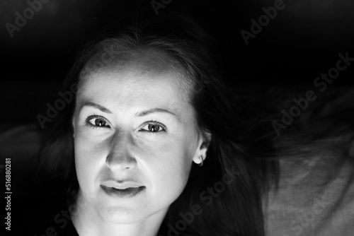 Black and white photo of an attractive woman. A large portrait on a dark background. Front view.