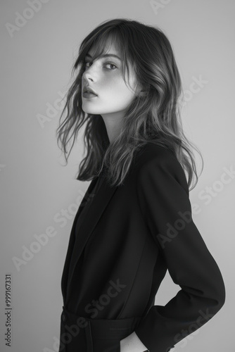 Black and white portrait of a young Caucasian woman with wavy hair, wearing a dark blazer, gazing thoughtfully to the side.
