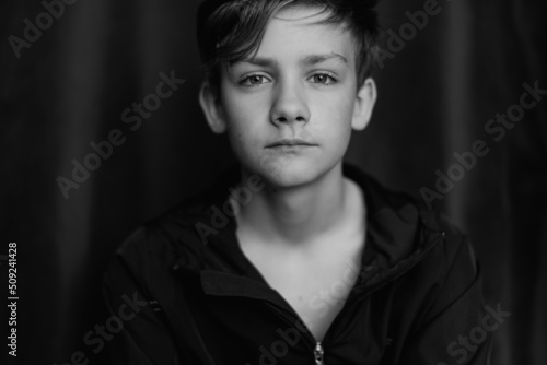 Black and white portrait of teenage boy on dark background. Low key close up shot of a young teen boy. Black and white photography. Selective focus