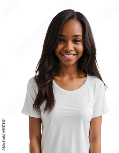 Black girl wearing a white t-shirt smiling and looking at the camera, Happiness concept, isolated, transparent background, no background. PNG.