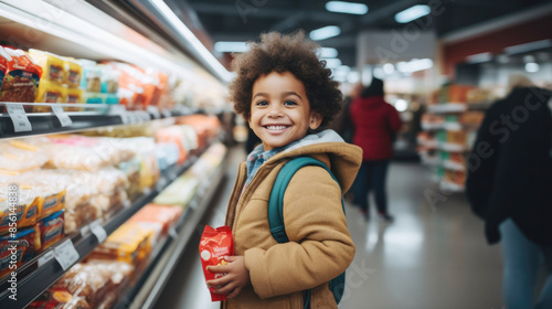 Black little boy in grocery store aisle, looking at camera, shopping concept