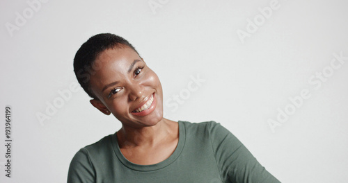 black woman with a short haircut in studio shootsmiling and wearing dress