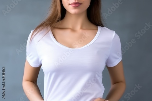 Blank white t-shirt, beautiful woman model wearing t-shirt at grey background