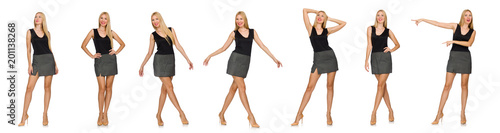 Blond hair model wearing gray skirt isolated on white