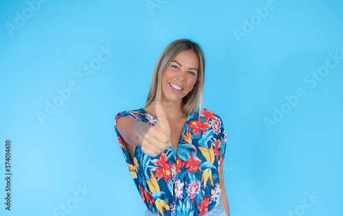 Blond woman with finger up gesture on blue background