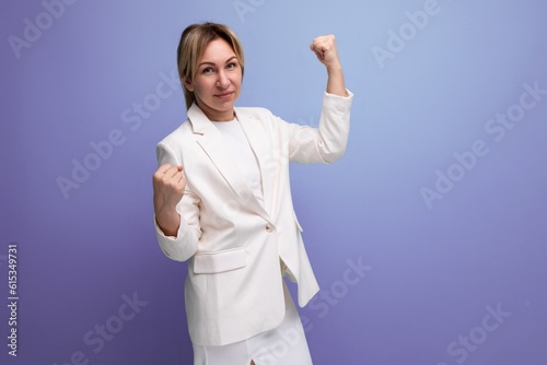 blond young business lady in an elegant jacket posing confidently on a studio background