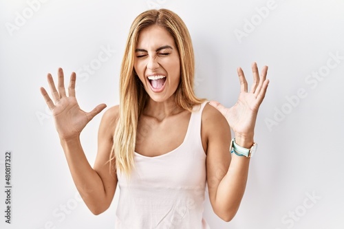 Blonde beautiful young woman standing over white isolated background celebrating mad and crazy for success with arms raised and closed eyes screaming excited. winner concept