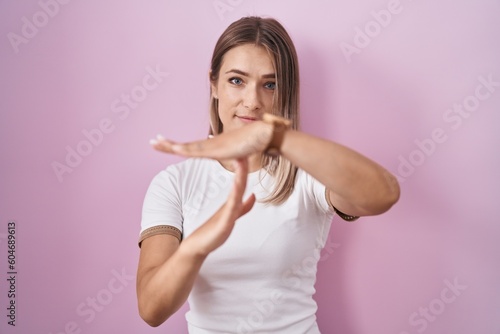 Blonde caucasian woman standing over pink background doing time out gesture with hands, frustrated and serious face