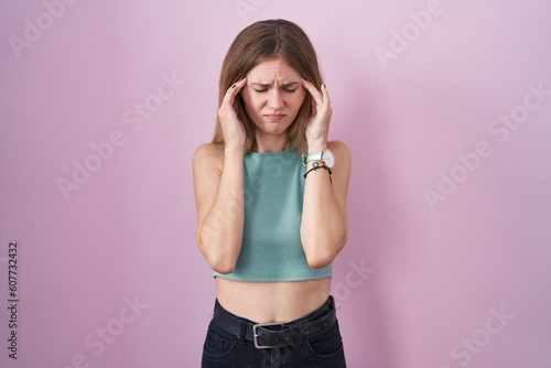 Blonde caucasian woman standing over pink background with hand on head, headache because stress. suffering migraine.