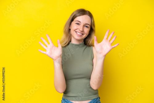 Blonde English young girl isolated on yellow background counting ten with fingers