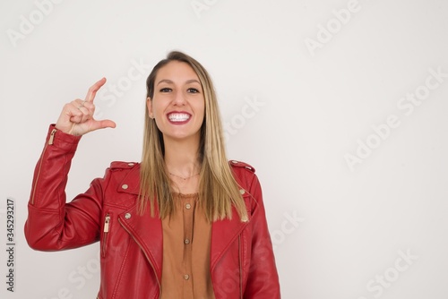 Blonde European woman over isolated background gesturing with hand showing small size, measure symbol. Smiling looking at the camera. Measuring concept.
