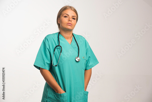 Blonde female doctor in blue uniform with stethoscope in the neck looks confident