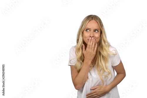 Blonde Frau hält sich die Hand vor den Mund und schaut verlegen