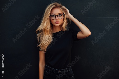 Blonde girl in urban style poses against black wall.