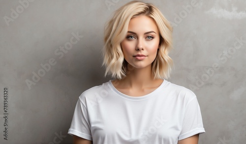 blonde girl wearing blank white t-shirt shirt on plain concrete wall background mockup from Generative AI