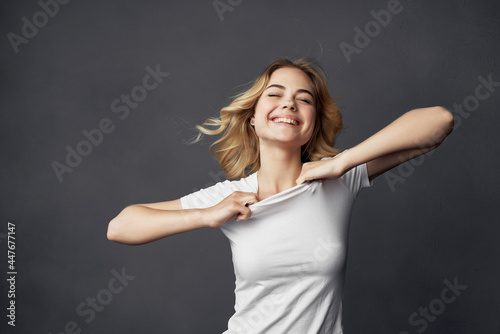 blonde in white t-shirt model posing studio dark background