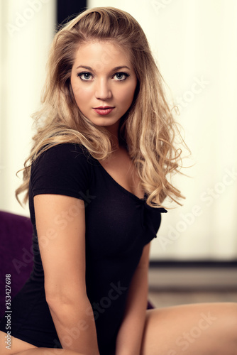Blonde junge Frau mit Locken in Body Dessous sitzend im Sessel