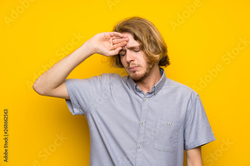 Blonde man over isolated yellow background with tired and sick expression