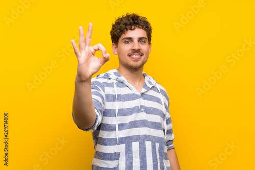 Blonde man over yellow wall showing an ok sign with fingers