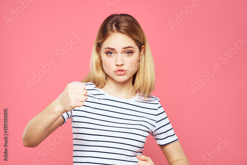Blonde striped t-shirt emotion gesture hands displeased facial expression pink background