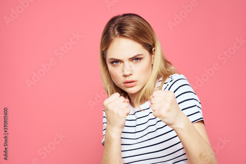 Blonde striped t-shirt emotion gesture hands displeased facial expression pink background